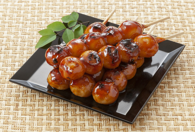 - 4の水気をふき、それぞれ15等分に切り、丸めて、水にぬらした竹串に5個ずつ刺す。