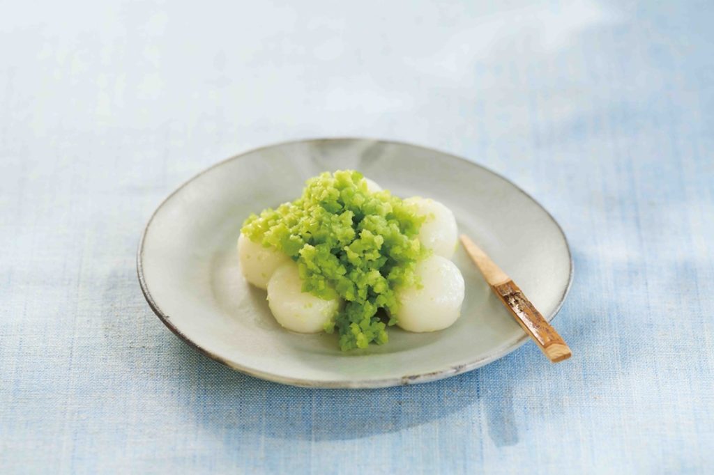 - 白玉団子をとり出し、枝豆餡を載せる。